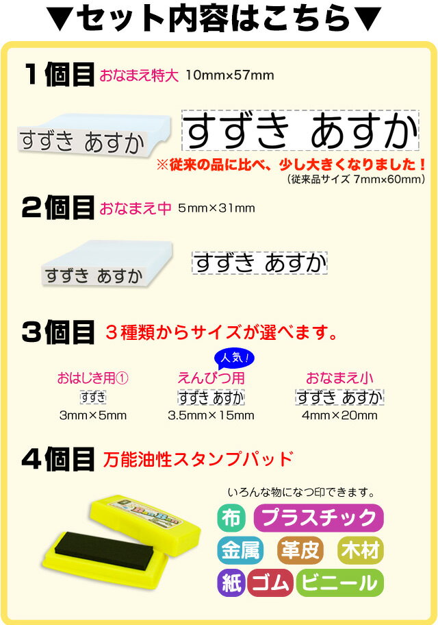 商品詳細 商品名 お名前スタンプ「ばんばんネーム」 【限定】お試しセットDX(デラックス)2 商品内容 ゴム印個数:合計3個 油性万能スタンプ台(黒)1個 書 体 学習用お名前丸ゴシック体 文字種 3個とも、ひらがな・カタカナ・漢字のいずれかのみ 製作内容 1人分のお名前(人名)としての製作になります。