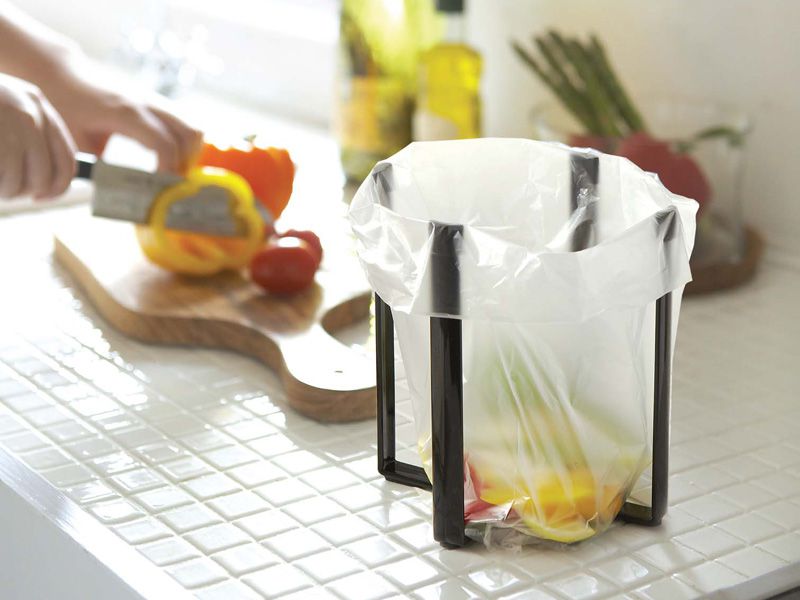 ポリ袋を引っ掛けて、調理時に出たゴミを捨てられる小さなゴミ箱に変身。