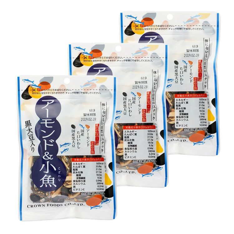【3袋】クラウンフーヅ アーモンド&小魚 黒大豆入り 68g 送料無料 クラウンフーズ アーモンド 小魚 黒大豆 カルシウム 【D】 【メール便】